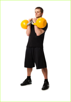 The handles of the kettlebells can be set up in one of two positions for the backswing: in a “V” so both handles swing back on the same 45 degree angle they would with a single clean or with both handles 90 degrees to your body